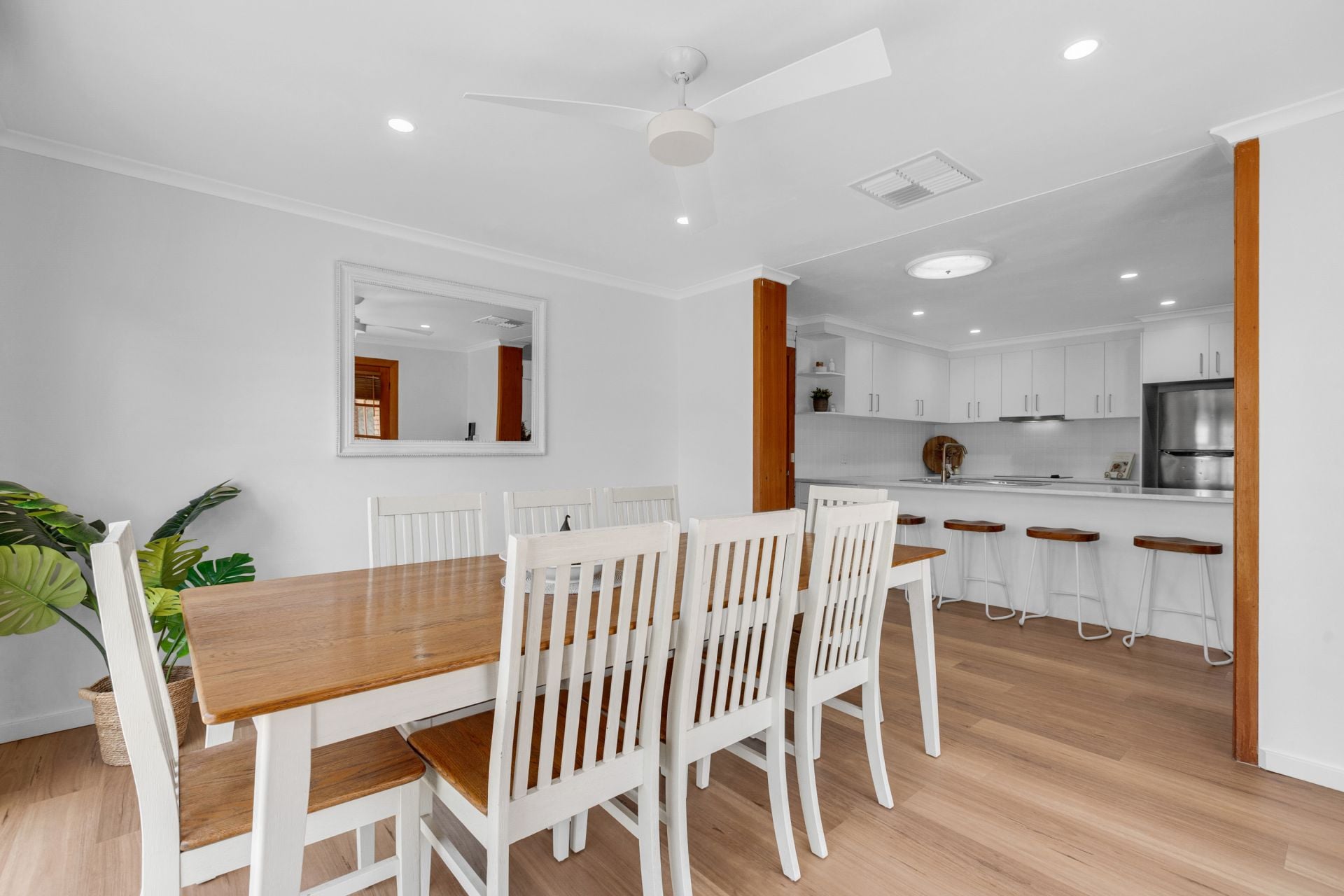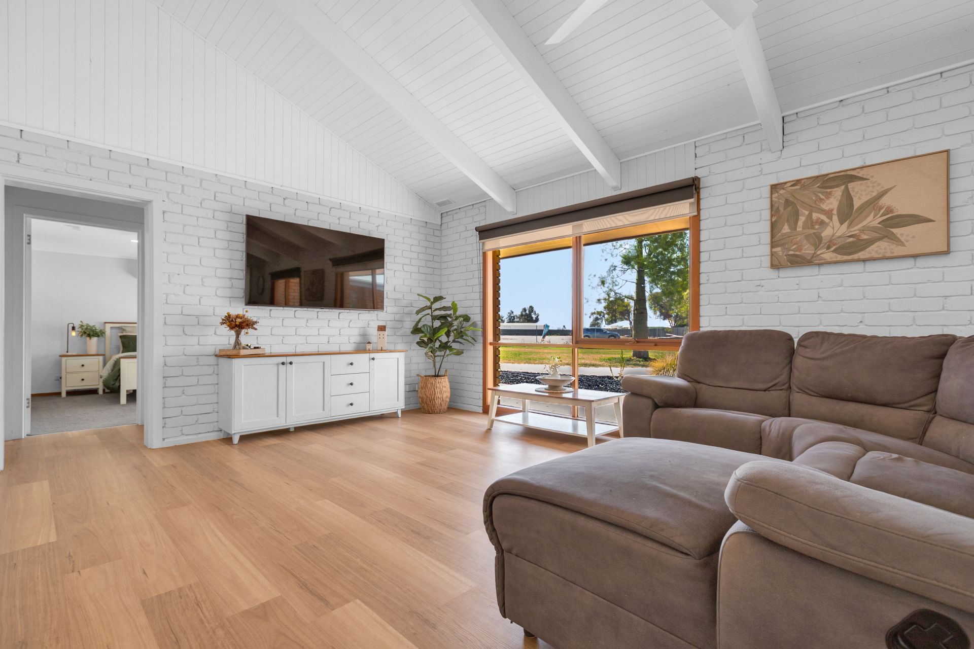 Inside, the home offers a warm, practical layout designed for real living, where the kitchen connects naturally to meals and living, and the light doesn't just enter the home… it stays. There's character here too, with exposed timber trusses and feature brickwork adding texture and charm, while everyday comfort is covered with ducted evaporative cooling and a slow-combustion fire for those cooler months.