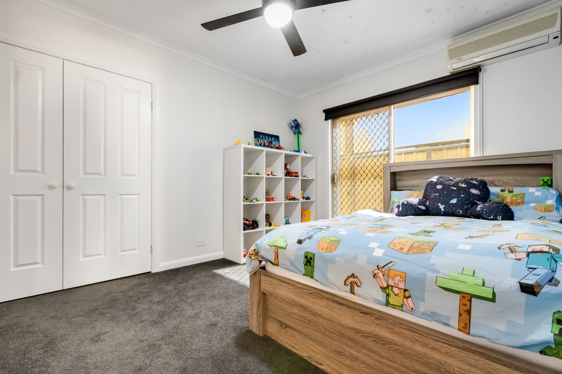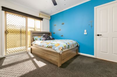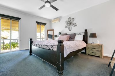 The master suite includes a walk-in robe, split system unit, ceiling fan, TV point, and a private ensuite. The second bedroom also has a split system unit for year-round comfort. Ceiling fans to all bedrooms and living areas.
