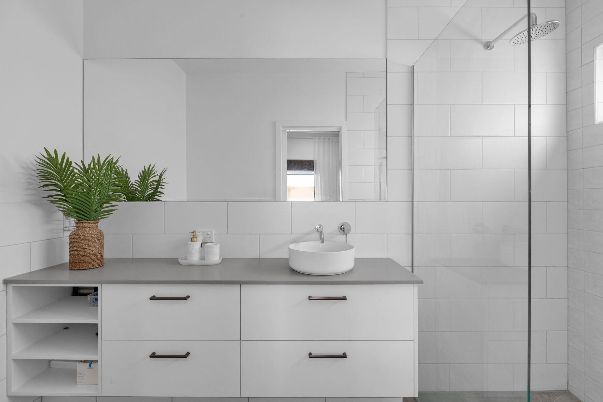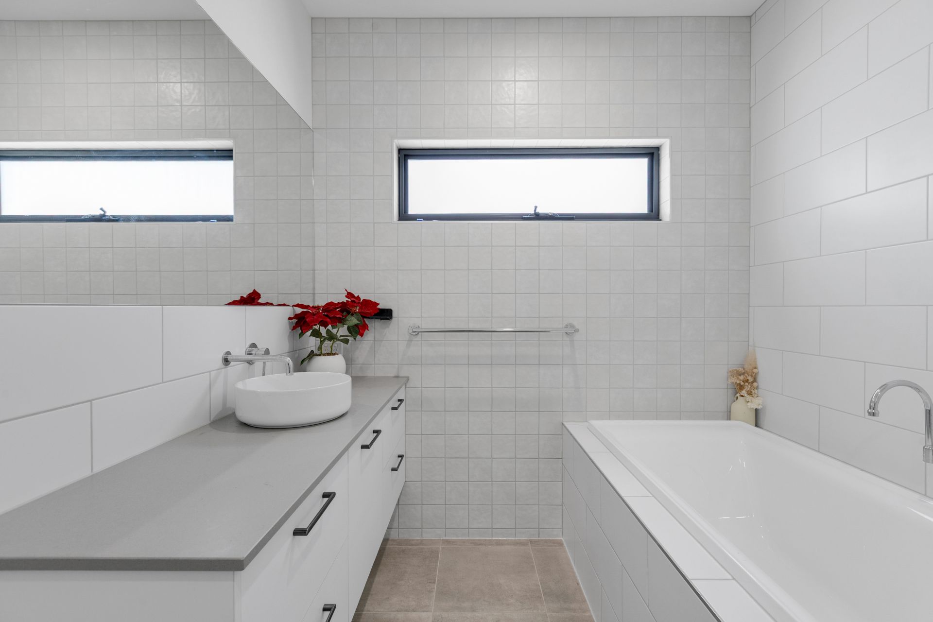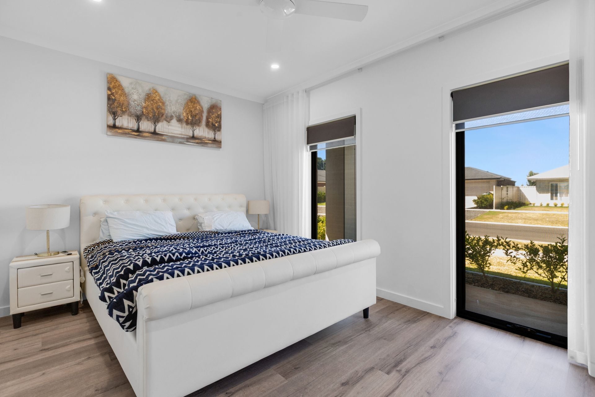 Accommodation includes four well-sized bedrooms, each fitted with ceiling fans and connected to ducted reverse cycle heating and cooling for year-round comfort. The master suite features a generous walk-in robe and a private ensuite with stone vanity and shower. The remaining three bedrooms include built-in robes and are serviced by a central bathroom offering a bath, stone vanity and separate shower.