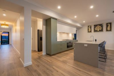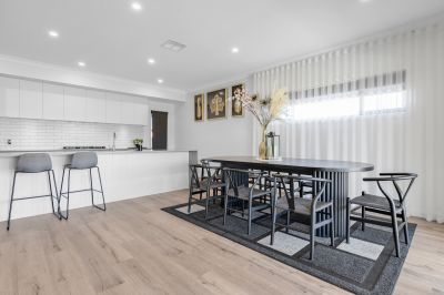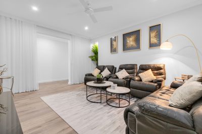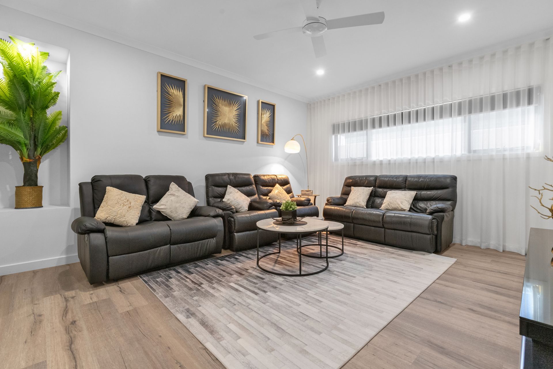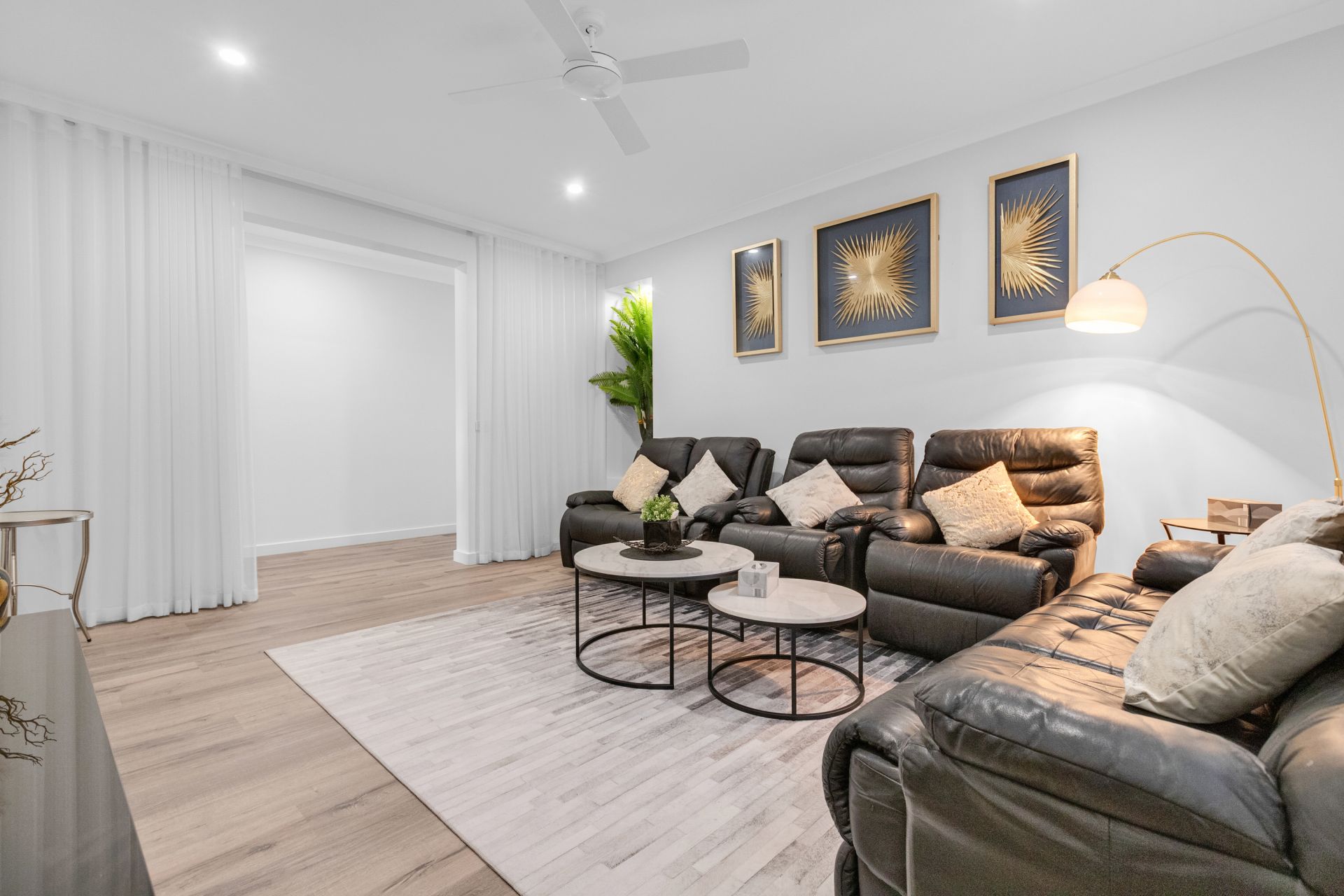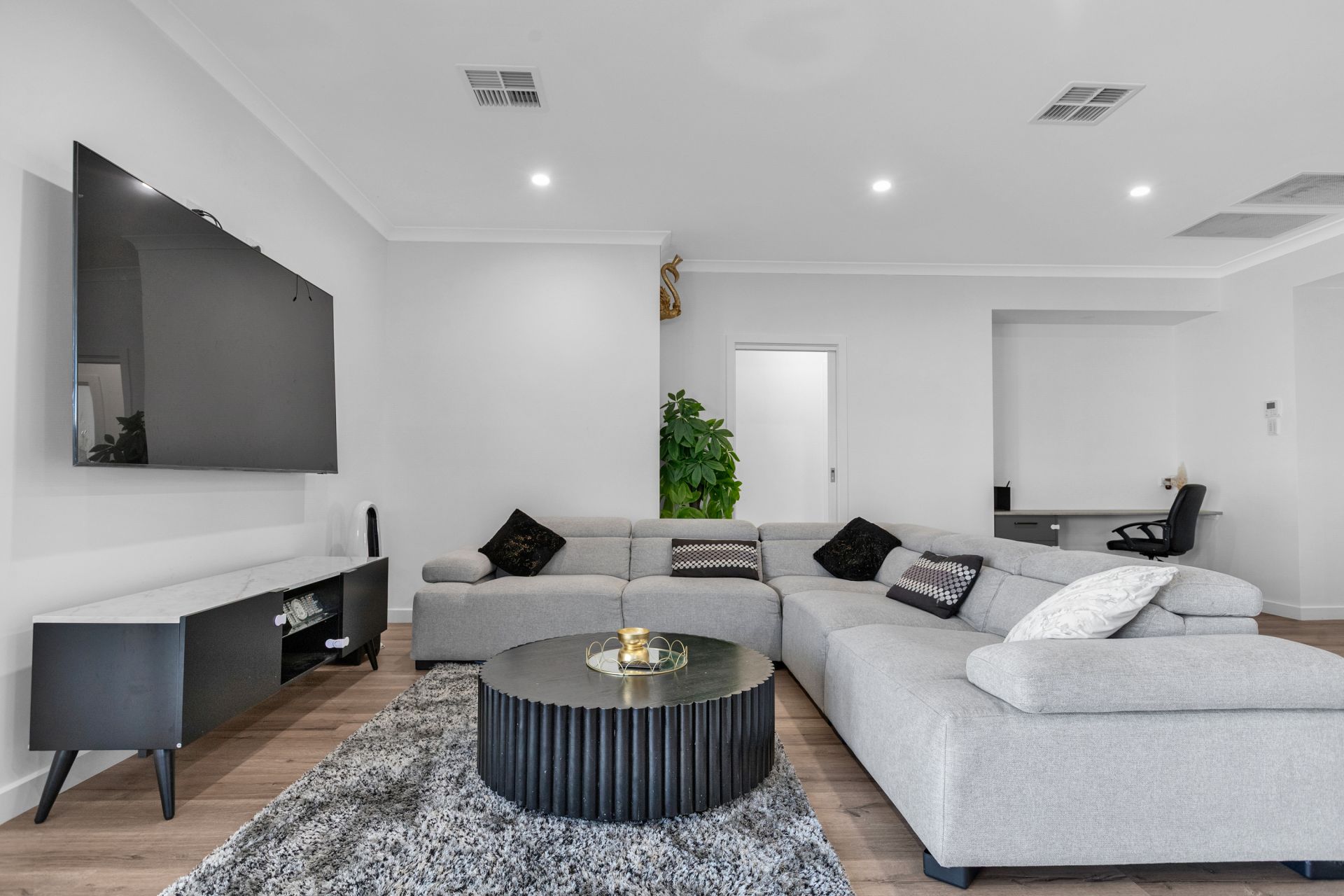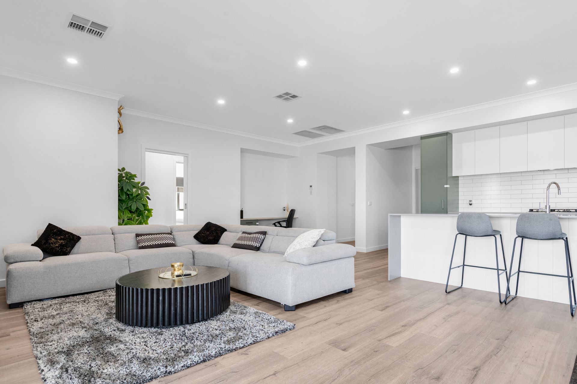 The home welcomes you with a wide hallway entry that flows through to a separate lounge, providing an ideal retreat for quiet relaxation. An expansive open-plan living, dining and kitchen zone forms the heart of the home, enhanced by a dedicated study area perfect for those working from home.